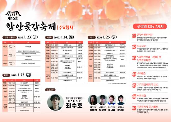 ÃàÁ¦ ù³¯ÀÎ 23ÀÏ(±Ý)¿¡´Â ¿ÀÈÄ 1½Ã 45ºÐ ¾Æ¶ó¾Ó»óºíÀÇ ½ÄÀü °ø¿¬À» ½ÃÀÛÀ¸·Î °³¸·½Ä°ú ´Ù¾çÇÑ Ã¼ÇèÇà»ç, Á÷°Å·¡ÀåÅͰ¡ ¿¸®¸ç ¿ÀÈÄ 5½Ã¿¡ Çà»ç°¡ ¸¶¹«¸®µÈ´Ù. 24ÀÏ(Åä)¿¡´Â ¡®³ë·¡°¡ ÁÁ´Ù¡¯ÀÇ ¹Ú»óÇö°ú ¡®¹Ì½ºÆ®·Ô¡¯ Ãâ½Å Á¦À̸°ÀÌ, 25ÀÏ(ÀÏ)¿¡´Â ±¹¾Ç°¡¼ö ȲÀÎ¾Æ¿Í ¡®¹Ì½ºÅÍÆ®·Ô¡¯ Ãâ½Å ÃÖ¼öÈ£°¡ ÃàÇϰø¿¬À» ÆîÃÄ ÃàÁ¦ ºÐÀ§±â¸¦ ÇÑÃþ µ¸¿ï °èȹÀÌ´Ù. ƯÈ÷ ÇԾȰù°¨ÃàÁ¦ÀÇ ´ëÇ¥ Çà»çÀÎ ¡®°ù°¨¸»À̶± ¸¸µé±â¡¯ Çà»ç¿Í ¡®°ù°¨ ³ë·¡ÀÚ¶û ´ëȸ¡¯´Â ÇØ¸¶´Ù ¸¹Àº Áö¿ª¹ÎÀÇ »ç¶ûÀ» ¹Þ°í ÀÖ´Ù.
