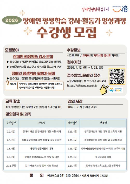 ¸ðÁý ÀοøÀº Àå¾ÖÀÎ Æò»ýÇнÀ Àü¹® °»ç 40¸í°ú Àå¾ÖÀÎ Æò»ýÇнÀ Ȱµ¿°¡ 10¸íÀÌ´Ù. Àü¹® °»ç´Â Àå¾ÖÀÎ Æò»ýÇнÀ ÇÁ·Î±×·¥ °ÀÇ Èñ¸ÁÀڷμ ½Åû ¸¶°¨ÀϱîÁö ½ÃÈï½Ã °»çÀºÇà¿¡ µî·ÏµÈ °»ç¿¡ ÇÑÇØ ½ÅûÇÒ ¼ö ÀÖÀ¸¸ç, Ȱµ¿°¡´Â Àå¾ÖÀÎ Æò»ýÇнÀ¿¡ °ü½É ÀÖ´Â ½ÃÈï½Ã¹ÎÀÌ¸é ´©±¸³ª Áö¿øÇÒ ¼ö ÀÖ´Ù.