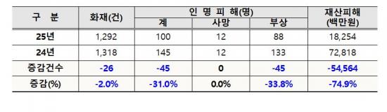 ¡Û ÀÎõ¼Ò¹æº»ºÎ¿¡ µû¸£¸é, 25³â ÀÎõ ³» ´ëÇü ÈÀç·Î ÀÎÇÑ '¼Ò¹æ ´ëÀÀ´Ü°è' ¹ß·É Ƚ¼ö´Â 3ȸ·Î ÀÌ´Â Àü³â ´ëºñ 75% °¨¼ÒÇÑ °ÍÀ¸·Î ³ªÅ¸³µ´Ù. ÈÀç°Ç¼ö´Â 1,292°ÇÀ¸·Î Àü³â ´ëºñ 2.0%°¡ °¨¼ÒÇß°í ÀθíÇÇÇØ(100¸í)µµ Àü³â ´ëºñ 31.0%°¡ °¨¼ÒÇß´Ù. Àç»êÇÇÇØ´Â 182¾ï¿øÀ¸·Î Àü³â´ëºñ 74.9%³ª °¨¼ÒÇß´Ù. ÀÌ´Â ÈÀç ¿¹¹æ ´ëÃ¥ºÎÅÍ ½Ã¹Î ±³À°, ÇöÀå ´ëÀÀ ½Ã½ºÅÛ °³¼±±îÁö À̾îÁö´Â ÃÎÃÎÇÑ ¾ÈÀü¸ÁÀÌ ÇöÀå¿¡¼ ½ÇÁúÀûÀÎ È¿°ú¸¦ ¹ßÈÖÇϰí ÀÖ´Â °ÍÀ¸·Î Ç®À̵ȴÙ.