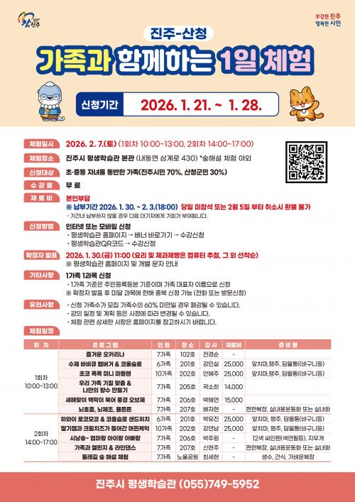 À̹ø üÇè Çà»ç´Â 2¿ù 7ÀÏ ÁøÁֽà Æò»ýÇнÀ°ü º»°ü µî¿¡¼ °³ÃֵǸç, ÃÊ¡¤Áßµî Àڳฦ µ¿¹ÝÇÑ ÁøÁֽùΰú »êû±º¹Î °¡Á·À» ´ë»óÀ¸·Î ÇÑ´Ù. ÇÁ·Î±×·¥Àº ¿ÀÀü°ú ¿ÀÈÄ·Î ³ª´µ¾î ÃÑ 11°³ °ú¸ñ, 81°¡Á· ±Ô¸ð·Î ÁøÇàµÉ ¿¹Á¤ÀÌ´Ù.